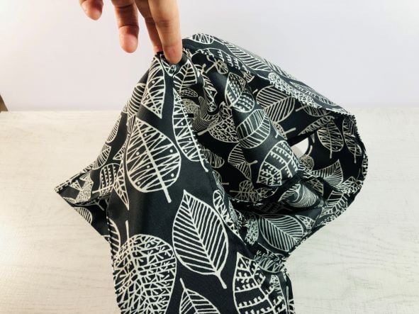 持ち手と本体の境目に三角の小さなフェイクレザーが縫い付けてあります